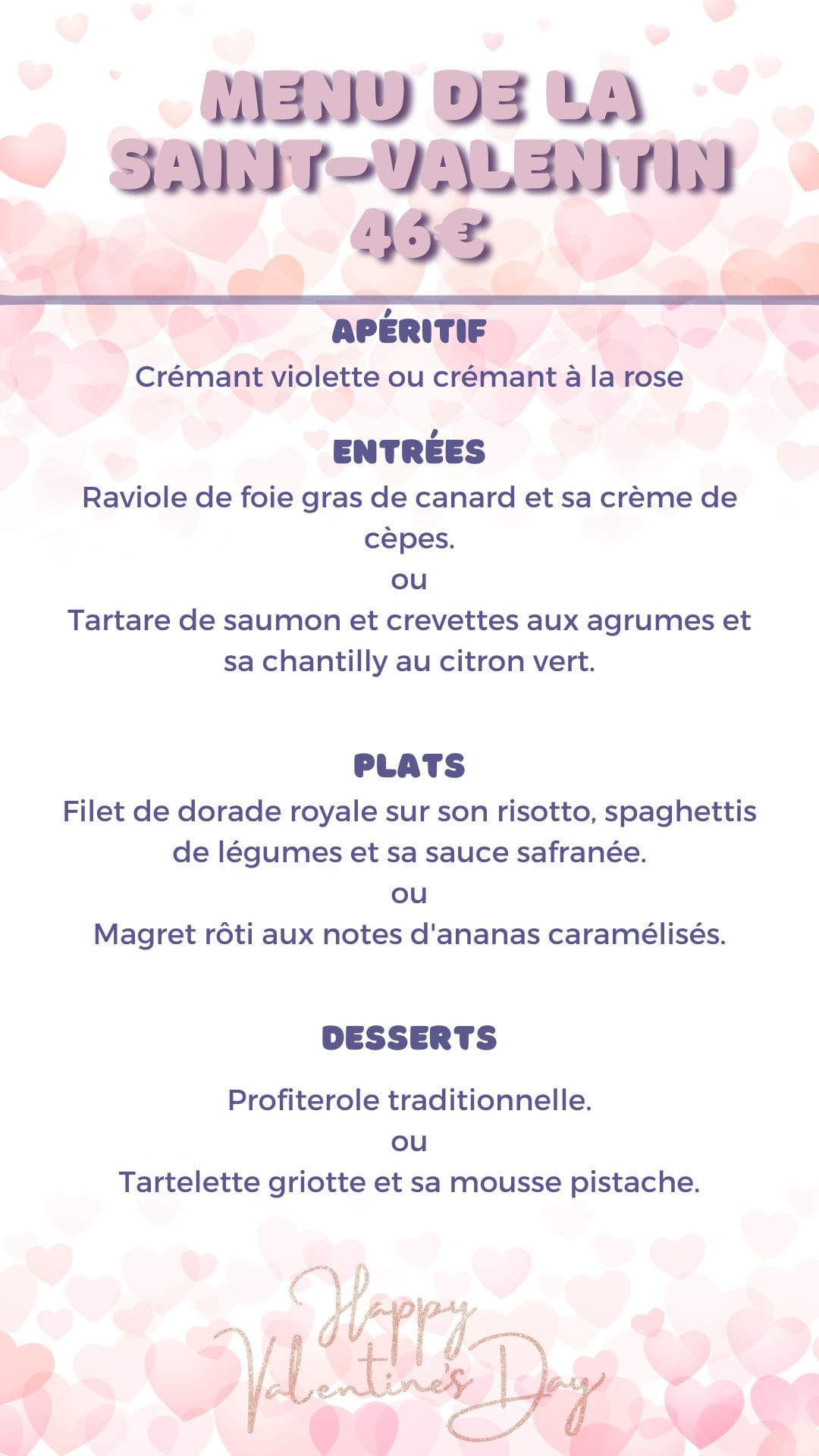 ♥ La Saint-Valentin approche, à cette occasion, découvrez notre menu Saint-Valentin servi le soir du mardi 14 février 2023 à partir de 19h00.